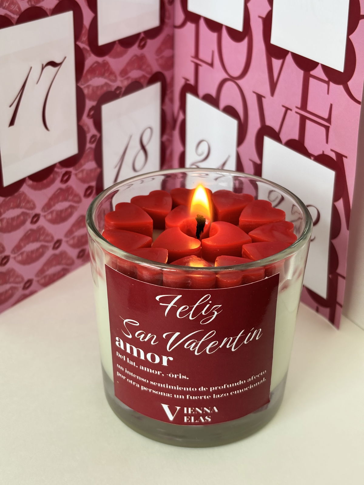Vela XL hecha con cera de soja 100% natural y esencias puras y concentradas, con una delicada decoración de corazones rojos.